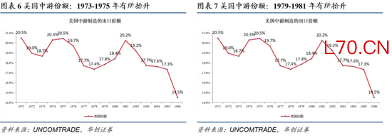第一,从历史规律来看,过去几十年油价暴涨周期中,当时的全球制造业强国,其中游制造的全球份额均实现了逆势提升。最典型的案例就是70年代全球滞胀期,成就了日本制造业的崛起,日本汽车、机电等产品的出口份额实现了大幅扩张。