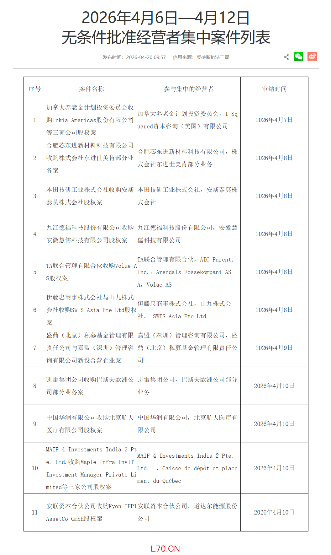 市场监管总局发布2026年4月13日—4月19日无条件批准经营者集中案件列表,其中包括山东黄金集团国际矿业开发有限公司与阿吉兰兄弟矿业公司新设合营企业案等。