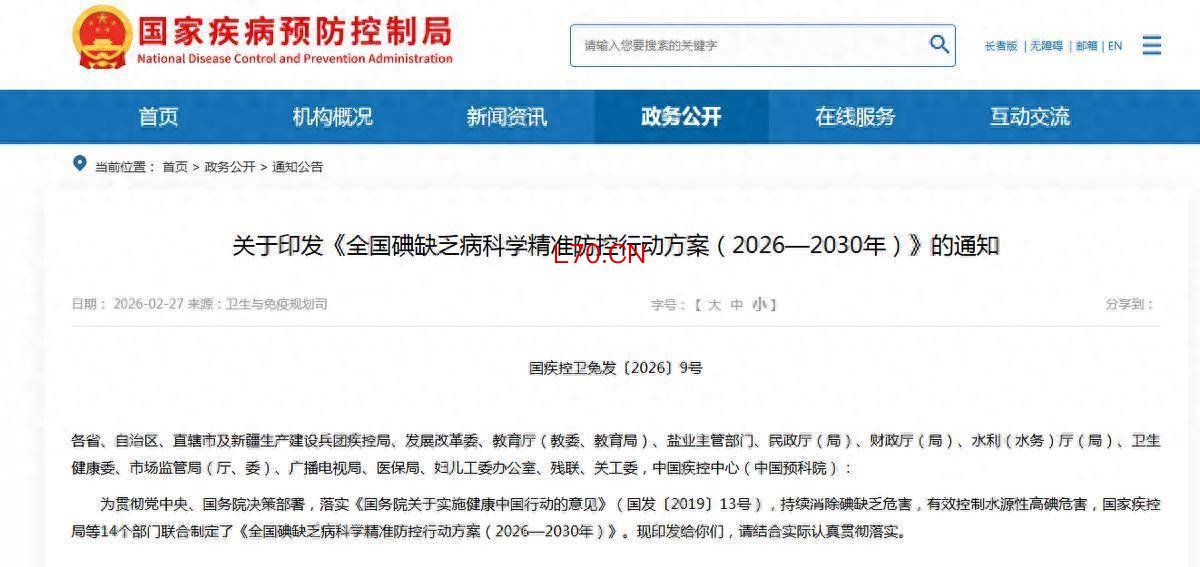 配资炒股(人民日报健康客户端记者 王思予)2月27日,国家疾病预防控制局等14个部门联合发布《全国碘缺乏病科学精准防控行动方案(2026—2030年)》(以下简称《方案》),明确将分区域实施精准补碘措施,优化食盐碘含量标准,提出到2030年实现全国碘缺乏病持续消除、水源性高碘危害有效控制的目标,进一步巩固我国碘缺乏病防治成果。