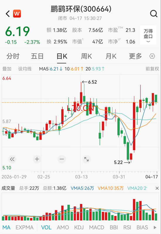截至4月17日收盘,鹏鹞环保股价报6.19元/股,最新市值为47亿元,最新股东户数为3.35万户。